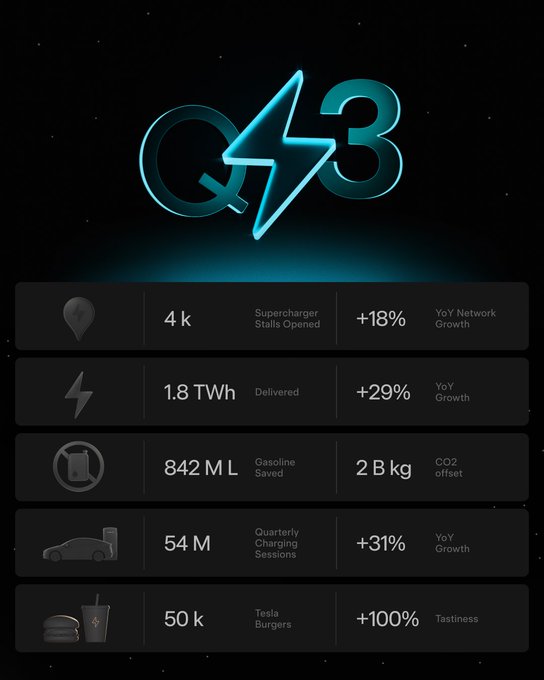 新增 4000 个超级充电桩,同比增长 18%向车辆输送电能达 1.8 太瓦时,同比增长 29%累计节省汽油 8.42 亿升,相当于减少 20 亿千克二氧化碳排放季度充电次数达 5400 万次,同比增长 31%IT之家注意到,除核心业务数据外,特斯拉还公布了洛杉矶超级充电餐厅第三季度的“特斯拉汉堡”销量,数据表现十分亮眼: